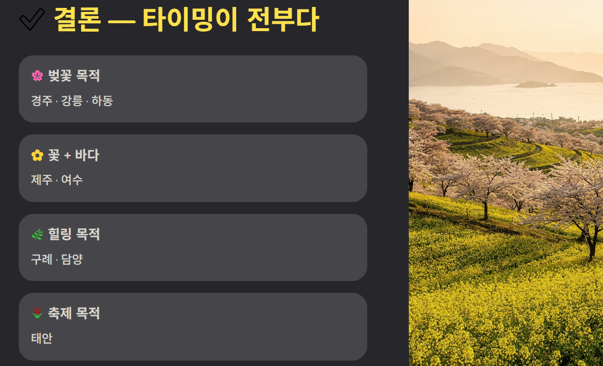 4월 국내 여행지는 선택이 아니라 전략이다. 벚꽃을 볼지, 유채꽃을 볼지, 바다를 갈지에 따라 여행 만족도가 완전히 달라진다.
