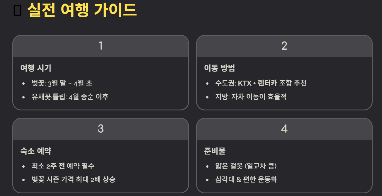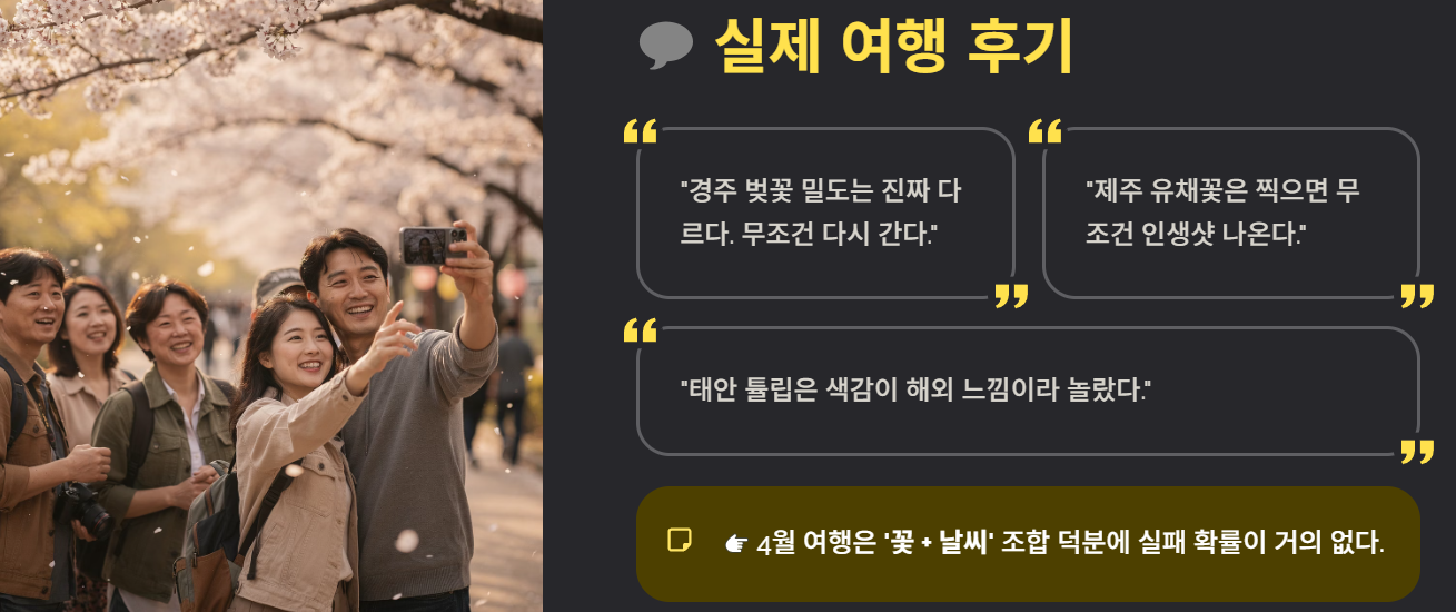 👉 결론: 4월 여행은 ‘꽃 + 날씨’ 조합이라 실패 확률이 거의 없다.